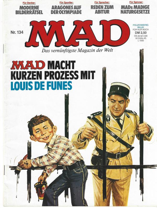 MAD Nr. 134 Titel: MAD macht kurzen Prozess mit Louis de Funes.Verlag: Williams Verlag GmbH HamburgComic Heft 34 SeitenFormat: 20,5 x 27 cmZustand: sehr gut, Papier leicht nachgedunkelt