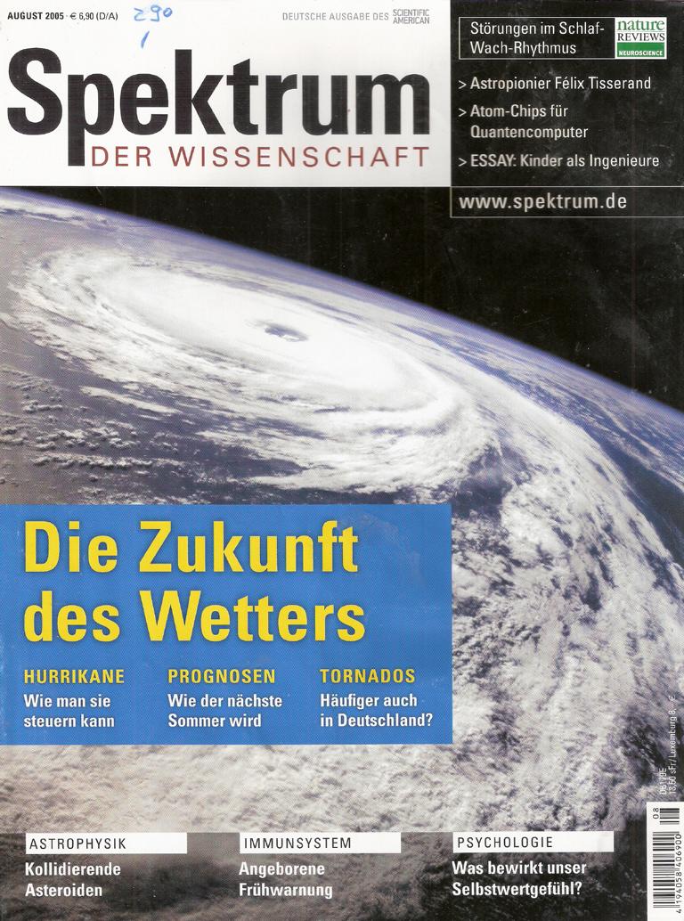 Spektrum der Wissenschaft August 2005Die Zukunft des WettersHurrikane - Prognosen - TornadosMagazin 114 SeitenFormat: 21,5 cm x 29 cm Gewicht: 267 gZustand: gutForschung - Wissenschaft