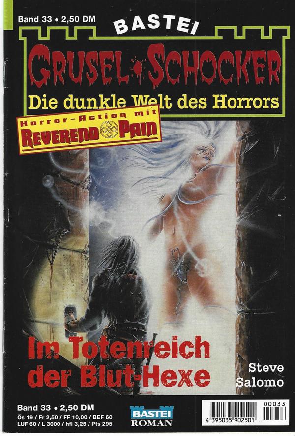 Grusel Schocker Nr. 33Die dunkle Welt des Horrors.Tirel: DIm Totenreich der Bluthexe.von: Steve SalomoVerlag: Bastei, Bergisch GladbachRomanheft 63 SeitenFormat: 15,5 x 22,5 cmZustand: sehr gut