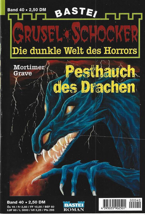 Grusel Schocker Nr. 40Die dunkle Welt des Horrors.Tirel: Pesthauch des Drachen.von: Mortimer GraveVerlag: Bastei, Bergisch GladbachRomanheft 63 SeitenFormat: 15,5 x 22,5 cmZustand: sehr gut