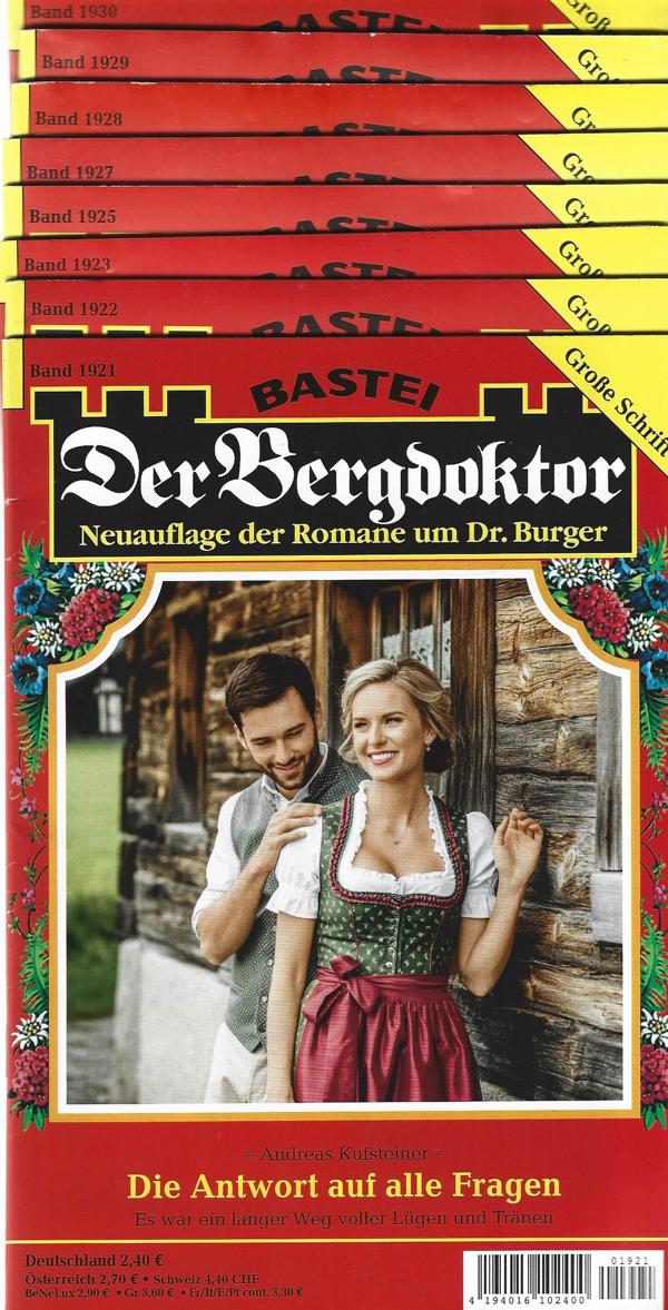 Der Bergdoktor 8 Romanhefte in großer SchriftNr. 1921, 1922,1923,1925,1927,1928,1929,1930.Bastei Verlag8Romanhefte á 62 SeitenFormar: 15 x 21,5 cm x 8 StückZustand: sehr gut