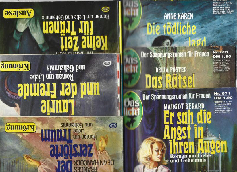 Alte Liebesromane - Moewig, Lore usw. ARZTROMANE + Der Bergdoktor BACCARA, Bianca, Natalie DESIREE - TANJA - TANGA - Caprice Fürstenromane - Schlossromane - Adel H. Courths-Mahler / F. Birkner / L. Behrendt HEIMATROMANE Humor - Gute Laune Romane - Familie Müller JANINE - JESSICA - JENNIFER JULIA - MY LADY - Corinna - Stefanie Love Affaire - Marilyn MAMI - KINDER SCHICKSAL - GELIEBTE MUTTI ROMANA - Sonja Roman SANDRA - OLIVIA - MYSTERY - Gaslicht - Schwarze Pe SILVIA / Bekenntnisse / Stelle TIFFANY - Mein Roman Rote Laterne - Wahre Geschichten - Schicksale...