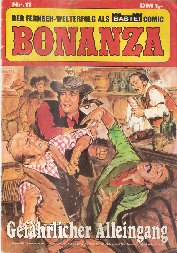 Bonanza Nr. 11Gefährlicher AlleingangVerlag: Bastei Verlag Bergisch GladbachHeft, 31 Seiten Format: 17,5 cm x 26 cm x 0,2 cmGewicht: 50 gZustand: gut, leichte Gebrauchsspuren,komplett mit Poster