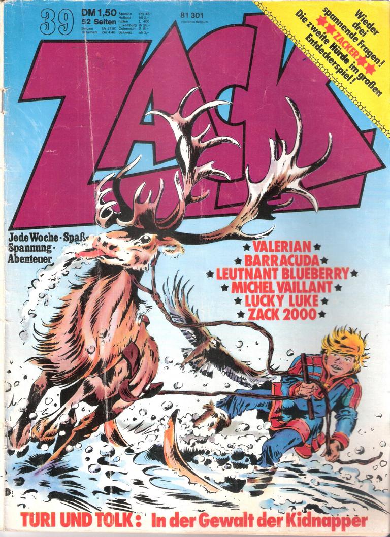 ZACK Die großen Abenteuer unserer ZeitNr. 39 / 1973Inhalt: Leutnant BlueberryZack 2000 BarracudaValerianMichel Vaillant Lucky LukeTuri und Tolk: In dr Gewalt der KidnapperVerlag: Koralle Verlag 1973Comic Hefte 49 SeitenFormat: 21 x 28 cmGewicht: 114 gZustand: gut, leichte Gebrauchsspuren,Cover mit KnickComic