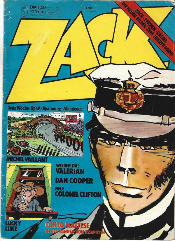 ZACK Die großen Abenteuer unserer Zeit Nr. 5 / 1974Inhalt: Colonel Clifton, Corto Maltese, Michael Vaillant,Lucky Luke, Valerian, Dan CooperVerlag: Koralle Verlag 1978Comic Hefte 51 SeitenFormat: 21 x 29 cmZustand: gebraucht, gut, Comic