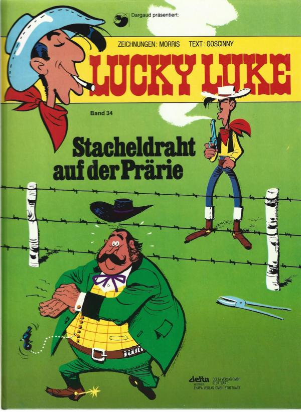 Lucky Luke Band 34von: Morris + GoscinnyTitel: Stacheldraht auf der Prärie.Verlag: Delta Verlag Stuttgart 1982Comic Hardcover 46 SeitenFormat: 21,5 x 28,5 cmZustand: sehr gut