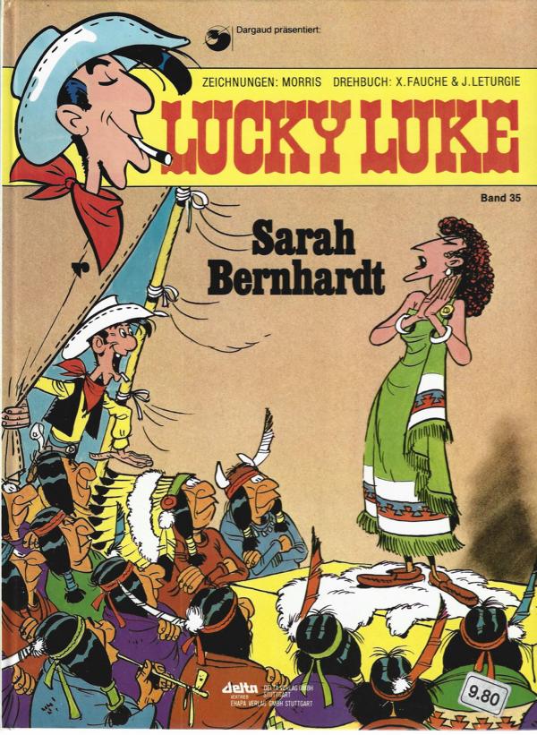 Lucky Luke Band 35von: Morris + GoscinnyTitel: Sarah Bernhardt.Verlag: Delta Verlag Stuttgart 1983Comic Hardcover 46 SeitenFormat: 21,5 x 28,5 cmZustand: sehr gut