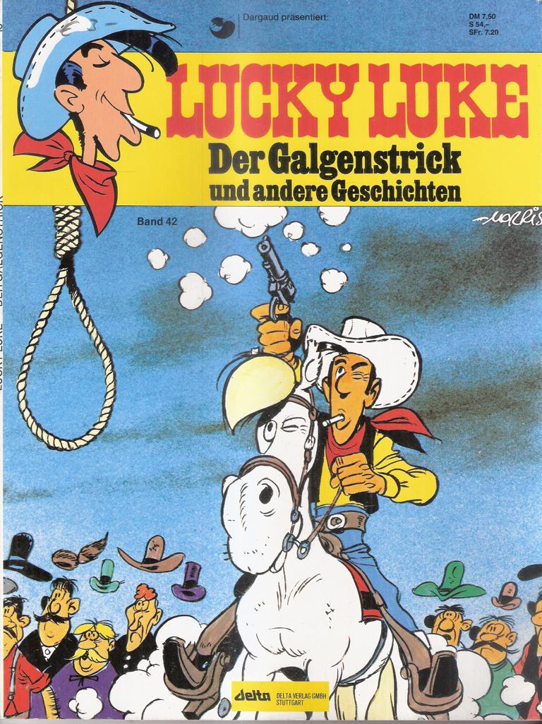 Lucky Luke Nr. 042Der Galgenstrick und andere GeschichtenZeichnungen: MorrisText: Vicq, Goscinny, Dom Domi, Lodewijk, De GrootVerlag: Delta Verlag Stuttgart 1996Comic 46 SeitenFormat: 21,5 x 28,5 cmGewicht: 170 gZustand: sehr gut