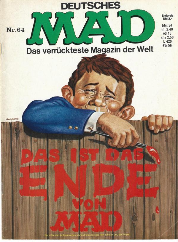 Comic - MAD Nr. 64 Das vernünftigste Magazin der WeltTitel: Das ist das Ende von MAD.Herausgeber: Klaus RechtRedaktion: Herbert FeuersteinVerlag: Williams Verlag GmbH HamburgComic Heft Format: 20,5 x 27 cmZustand: gut, Papier altersbedingt leicht nachgedunkelt