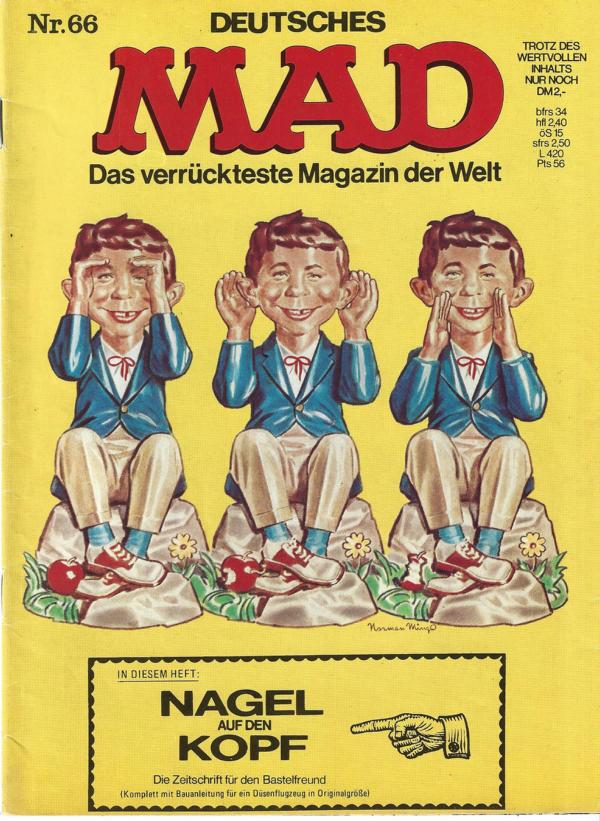 Comic - MAD Nr. 66 Das vernünftigste Magazin der WeltTitel: Nagel auf sen KopfHerausgeber: Klaus RechtRedaktion: Herbert FeuersteinVerlag: Williams Verlag GmbH HamburgComic Heft Format: 20,5 x 27 cmZustand: gut, Papier altersbedingt leicht nachgedunkelt