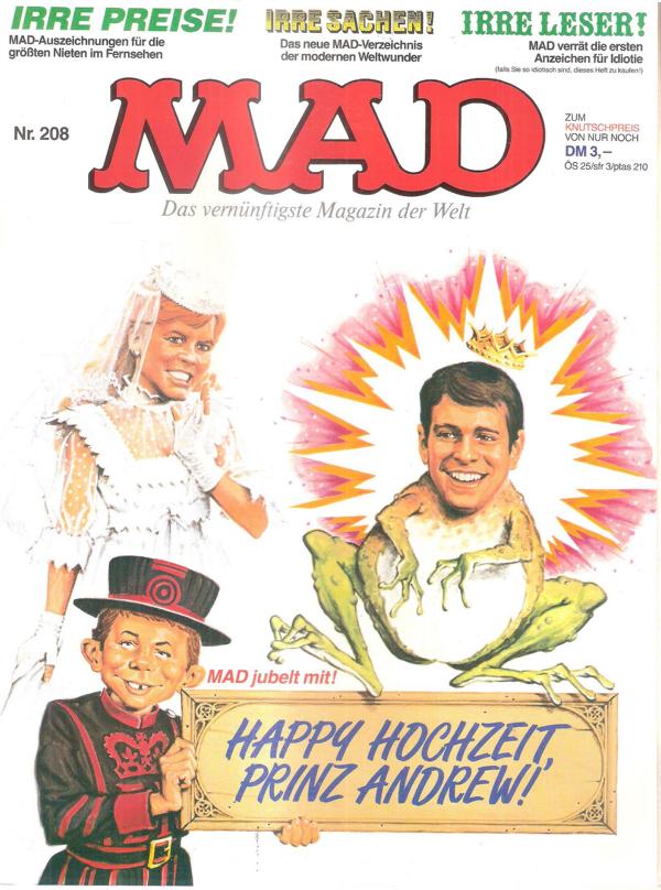Comic - MAD Nr. 208Das vernünftigste Magazin der WeltTitel: MAD jubelt mit!Happy Hochzeit, Prinz Andrew!Verlag: Williams VerlagMagazin 33 SeitenFormat: 20 cm x 27 cmZustand: gebraucht, gut