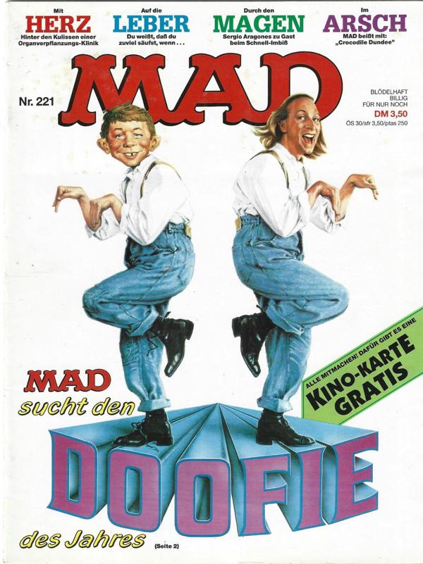 Comic - MAD Nr. 221Das vernünftigste Magazin der WeltTitel: MAD sucht den Doofie des Jahres"Verlag: Williams Verlag BerlinMagazin 32 SeitenFormat: 20 cm x 27 cmZustand: gut, leichte Gebrauchsspuren(Papier altersbedingt nachgedunkelt)