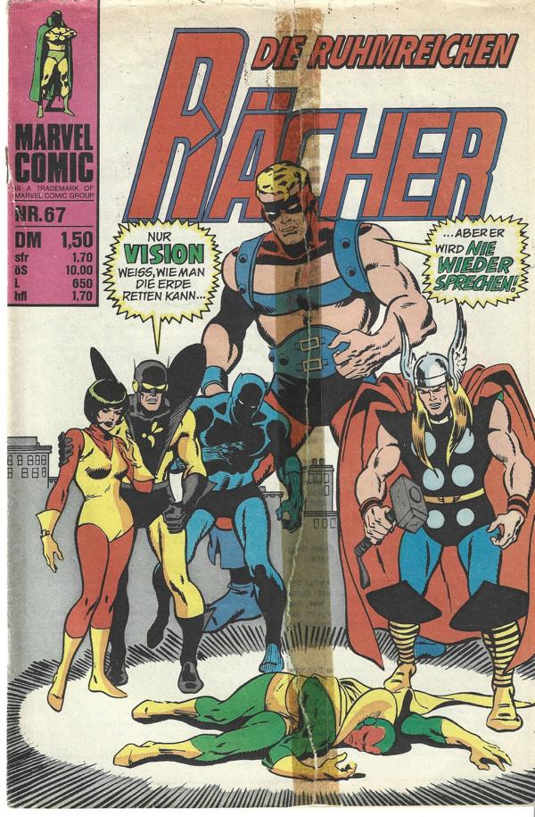 Marvel-Comic Nr. 67 - Die ruhmreichen RächerVerlag: Williams Verlag Hamburg (c) 1976Comic Heft 29 SeitenFormat: 17 x 24,5 cmZustand: deutlihe Gebrauchsspuren,Titelblatt durchgerissen, mit Tesa geklebt