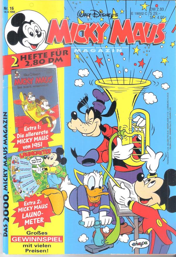 Walt Disneys Micky Maus Heft Nr. 16/1994mit Micky Maus von 1951 + LaunometerEhapa Verlag 1994Comic Heft, 53 SeitenFormat: 17,5 x 26 cmGewicht: 154 gZustand: gut