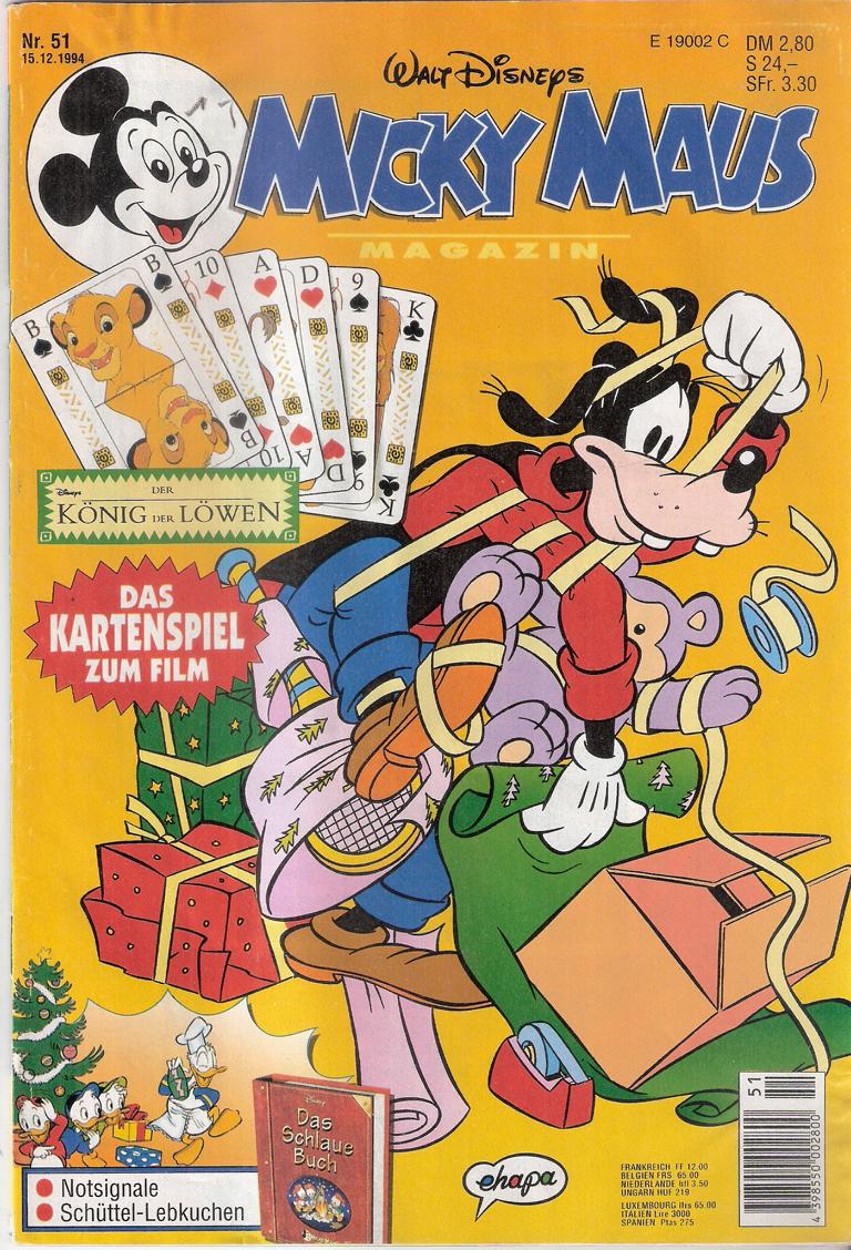Walt Disneys Micky Maus Heft Nr. 51/1994ohne BeilagenEhapa Verlag 1994Comic Heft, 53 SeitenFormat: 17,5 x 26 cmGewicht: 80 gZustand: gut, leichte Gebrauchsspuren