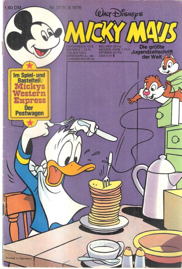 Micky Maus Heft 1976 Nr. 37Ehapa Verlag 1976Comic Heft, 41 SeitenFormat: 17,5 x 26 cmZustand: gut, mit leichten Gebrauchsspuren,Seite 21 -24 fehlt