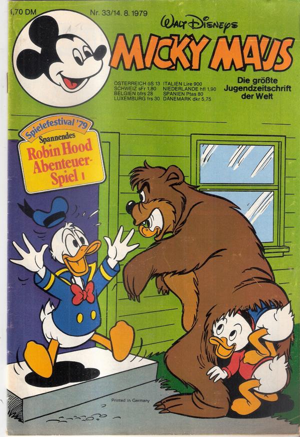 Walt Disneys Micky Maus Heft Nr. 33/1979ohne Beilagen Ehapa Verlag 1979Comic Heft, 43 SeitenFormat: 17,5 x 26 cmGewicht: 63 gZustand: gut