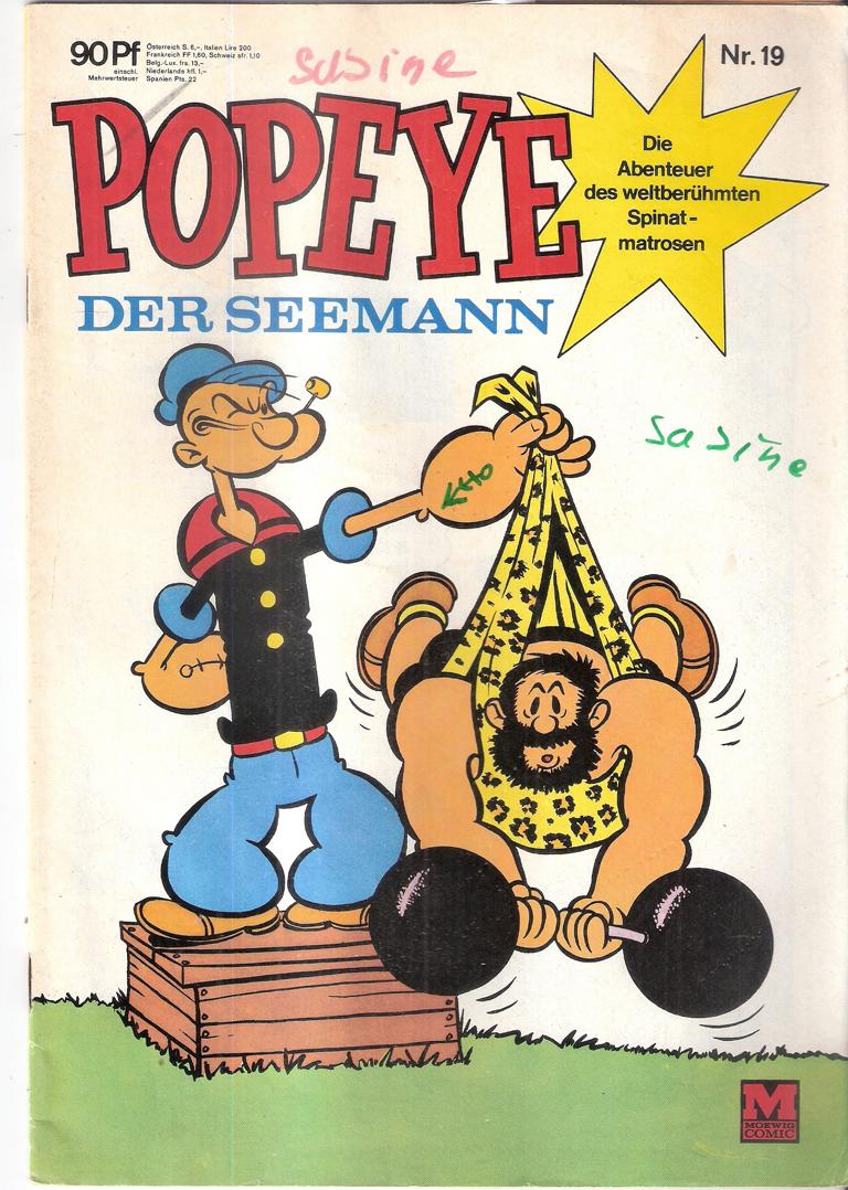 Popeye der Seemann Nr. 19Die Abenteuer des weltberühmten Spinatmatrosen.Moewig Verlag (c) 1969Comic Heft, 30 SeitenFormat: 18x26cmGewicht: 53 gZustand: deutliche Gebrauchsspuren,Cover vorne beschrieben, Seite 29ist oben ein Stück herausgerissen.