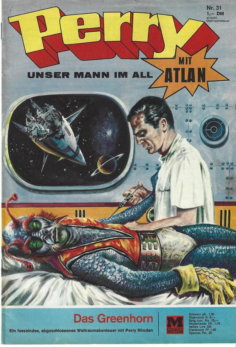 Perry unser Mann im All Nr.31 Titel: Das GreenhornVerlag: Moewig , 1969Comic Heft 30 SeitenFormat: 17,5 x 24 cmGewicht: 61 gZustand: gebraucht, sehr gut