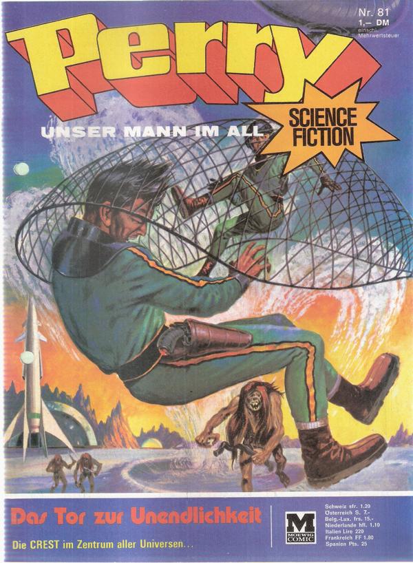 Perry unser Mann im All Nr.81Titel: Das Tor zur UnendlichkeitVerlag: Moewig , 1973Comic Heft 30 SeitenFormat: 18 x 26 cmGewicht: 54 gZustand: gelocht, sonst gut