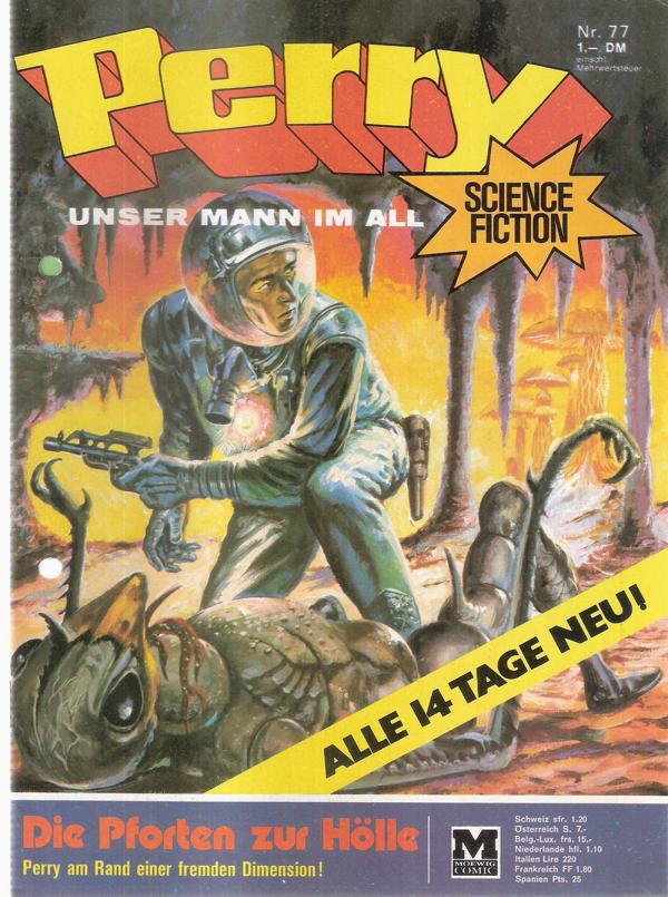 Perry unser Mann im All Nr.77Titel: Die Pforten zur HölleVerlag: Moewig , 1973Comic Heft 30 SeitenFormat: 17,5 x 24 cmGewicht: 50 gZustand: gelocht, sehr gut
