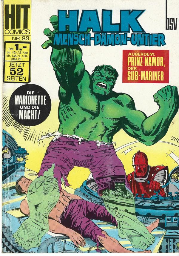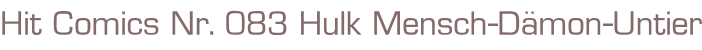 Hit Comics - HULK Mensch-Dämon-Untier Nr. 83Bildschriftenverlag GmbH, Aachen, (c) 1968Comic Heft, schwarz-weißFormat: 17,5 x 25 cmZustand: gut, leichte Gebrauchsspuren am Falz