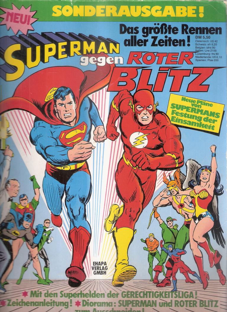 Superman gegen roter BlitzVerlag: Ehapa Verlag GmbH, Softcover, Seiten 81Format: 22,5 x 30,5 x 0,5 cm Gewicht: 245 gZustand: Deutliche Gebrauchsspuren am Cover, Seiten teilweise fleckig, trotz allemnoch relativ gut erhaltenes Exemplar