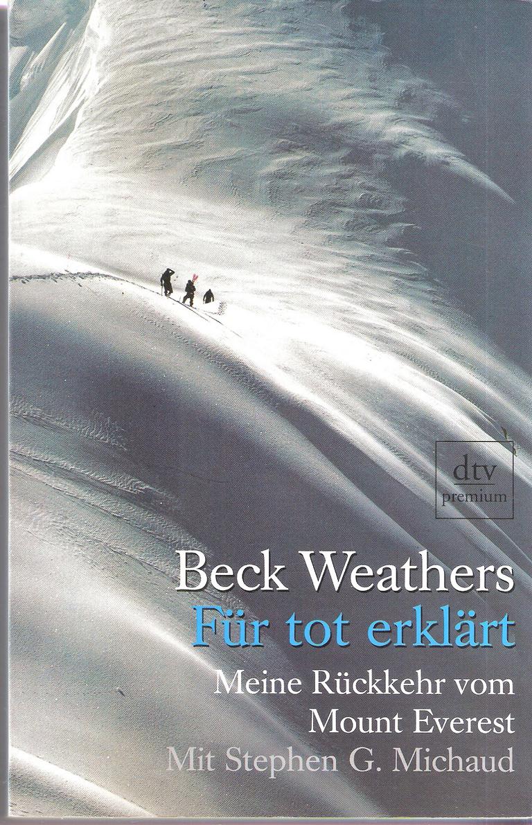 Für tot erklärtMeine Rückkehr vom Mount EversetAutor: Beck Weathersmit Stephen G. MichaudAus dem Englischen von Hartmut SchickertISBN 3423242280Verlag: Deutscher Taschenbuch Verlag 2. Auflage 2000Taschenbuch 257 SeitenFormat: 13,5 x 21 x 2,5 cmGewicht: 394 gZustand: gut bis sehr gutBiografie - Lebenserfahrung -