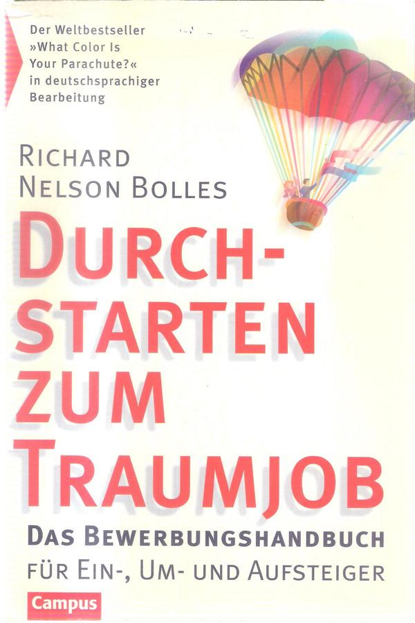 Titel: Durchstarten zum TraumjobDas Bewerbungshandbuchfür Ein-, Um- und AufsteigerISBN 9783593362946von: Richard Nelson BollesVerlag: Campus Verlag 20003. AuflageSoftcover 340 SeitenFormat: 15 x 22,5 x 2 cm Zustand: gebraucht, guter Zustand