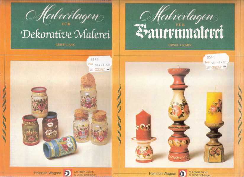 Malvorlagen für Dekorative Malerei von Gerit Langund Bauernmalerei von Ursula KähnVerlag: Heinrich Wagner 1982jeweils 3 Blumenbilder-VorlagenFormat: 29 x 21 cmGewicht: 60 gZustand: sehr gut