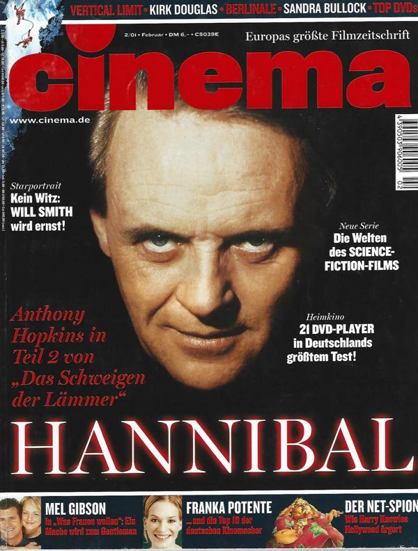 Europas größte FilmzeitschriftCinema Nr. 02/2001Titel: HannibalMagazin, 148 SeitenFormat: 20,5 x 28 x 1 cm Zustand: gut, leichte Gebrauchsspuren Genre: Film - Filmmagazin