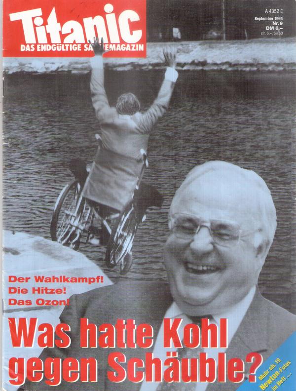 Titanic Nr. 9/1994Titel: Was hatte Kohl gegen Schäuble?Zeitschrift, 66 SeitenFormat: 21 x 28Gewicht: 143 gZustand: leichte Gebrauchsspuren Zeitschrift -
