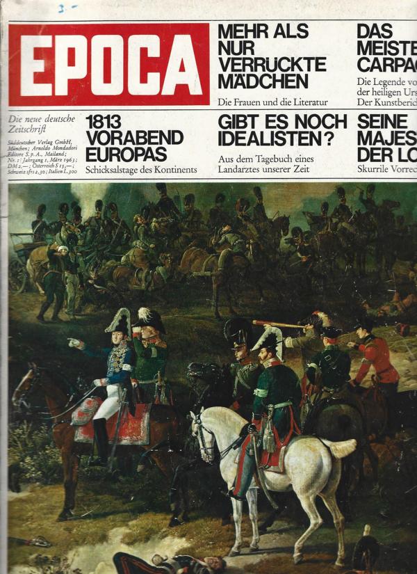 EPOCHA Nr. 1 März 1963Jahrgang 1Verlag: Süddeutscher Verlag GmbHMünchen, Arnoldo MondadoriZeitschrift, 98 SeitenFormat: 26 x 33,5 cmwegen Übergröße beträgt das Posto 8,50 EuroZustand: sehr gut erhaltenes Exemplar
