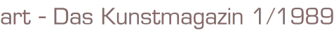 art - Das Kunstmagazin - 1/1989Inhalt: Erfolg auf den Holzweg - Stehan BalkenholAlle Macht den Sponsoren Das Welttheater der Aloise Englands Malerfürst Joshua Reynolds Magazin, 126 SeitenFormat: 21,5 cm x 28 cmGewicht: 377 g Zustand: gut