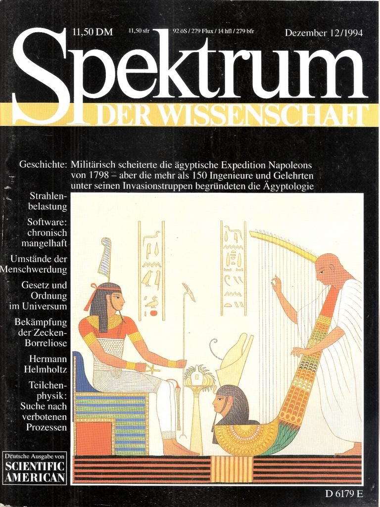 Spektrum der Wissenschaft 12/1994Deutsche Ausgabe von Scientific AmericanInhalt: Geschichte: Militärisch scheiterte die ägyptische Expedition Napoleons von 1798 ...- Strahlenbelastung- Software: chronisch mangelhaft- Gesetz und Ordnung im Universum- Bekämpfung der Zecken-Borreliose- Hermann Helmholz- Teilchenphysik: Suche nach verbotenen ProzessenMagazin 162 SeitenFormat: 21 cm x 28 cmGewicht: 370 gZustand: gut