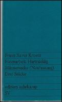 Titel: Heimarbeit. Hartnäckig. Männersache(Neufassung)Drei StückeAutor: Franz Xaver KroetzVerlag: Suhrkamp VerlagFrankfurt am Main 1970Taschenbuch 97 SeitenFormat: 11 x 17,7 x 1 cmZustand: gut, leichte Standspuren