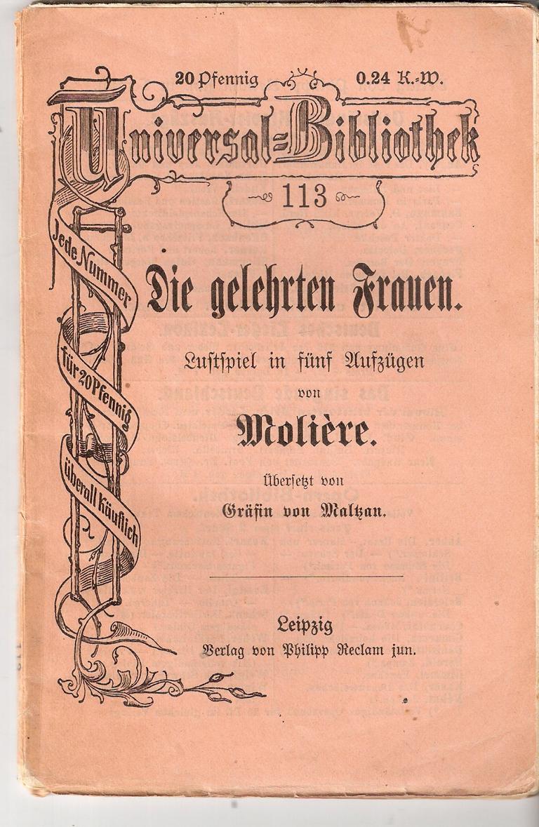 Lustspiel in fünf AufzügenRECLAMS UNIVERSAL BIBLIOTHEKNr. 113Autor: MoliereÜbersetzt von Gräfin von MaltzanVerlag: Philipp Reclam jun.Bändchen 60 SeitenFormat: 10 cm x 15,5 cmGewicht: 40 gZustand: Deutliche Stand- und Gebrauchsspuren,Buchrücken mit Tesa geklebtSammlerstück - Rarität