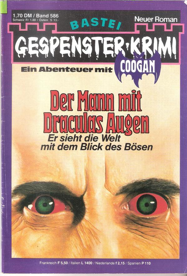 Gespenster Krimi Nr. 586Ein Abenteuer mit Coogan Titel: Der Mann mit Draculas Augen Er sieht die Welt mit dem Blick des Bösen Autor: Damian Fox Bastei VerlagRomanheft 64 SeitenFormat: 15,5 x 22,5 cmGewicht: 69 gZustand: gebraucht, gut