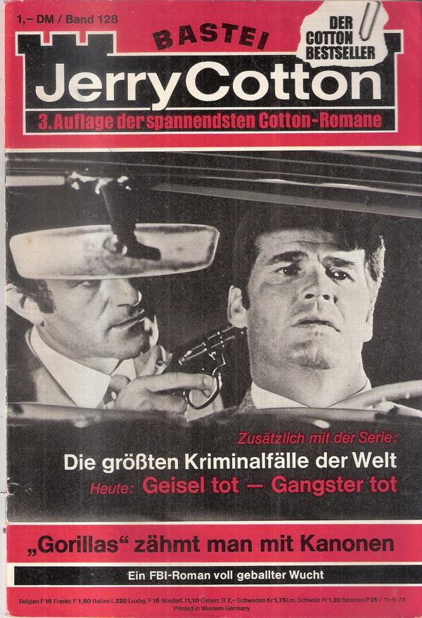 Jerry Cotton Nr. 0128 "Gorilllas zähmt man mit....3. AuflageBastei Verlag Romanheft 64 SeitenFormat: 15 x 22,5 cmGewicht: 73 gZustand: gut