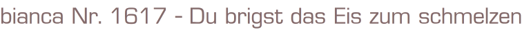 BIANCA Nr. 1617 - Neue Liebe neues GlückTitel: Du bringst das Eis zum schmelzenAutor: Teresa SouthwickCora Verlag 2008Heft, Format: 13 cm x 18 cmGewicht: 110 gZustand: gut, leichte Gebrauchsspuren
