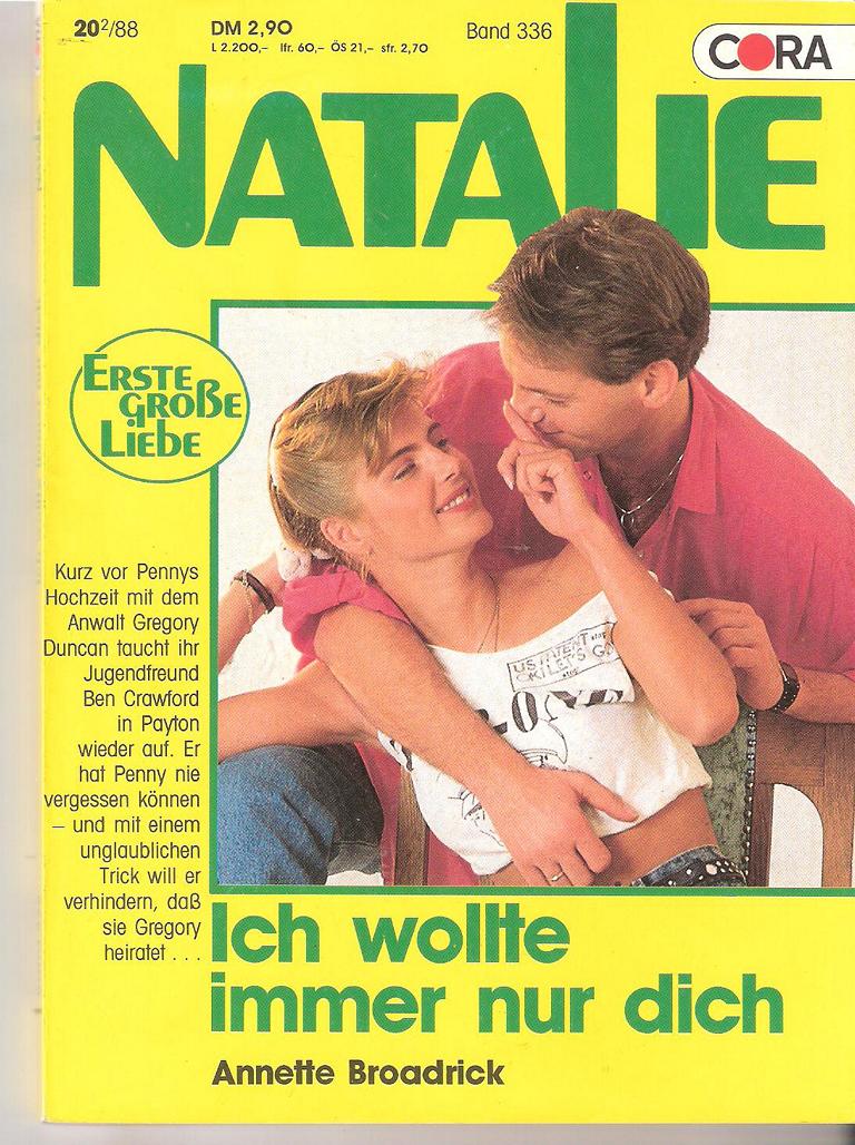 NATALIE Nr. 336Titel: Ich wollte immer nur dichAutor: Annette BroadrickCora Verlag 1988Taschenbuch, Format: 13 cm x 18 cmGewicht: 95 gZustand: gebraucht, sehr gut