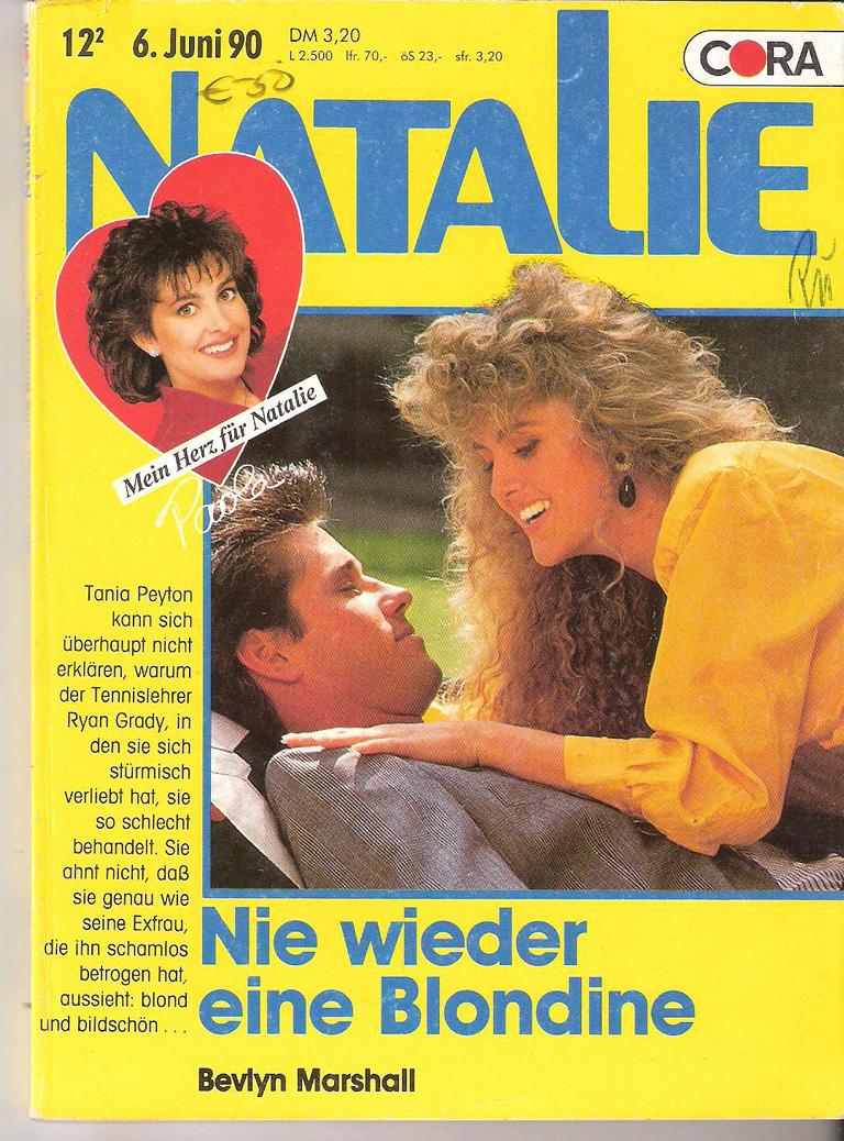 NATALIE Nr. 424Titel: Nie wieder eine BlondineAutor: Bevlyn MarshalCora Verlag 1990Taschenbuch, Format: 13 cm x 18 cmGewicht: 95 gZustand: gut