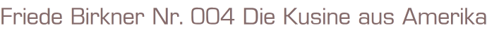 Friede Birkner Nr. 4Die schönsten Romane der Tochter vonHedwig Courths MahlerTitel: Die Kusine aus AmerikaVerlag: Bastei LübbeRomanhefte 65 SeitenFormat: 15,5 x 22,5 cmGewicht: 65 gZustand: gebraucht, gutRomanhefte - Liebesromane