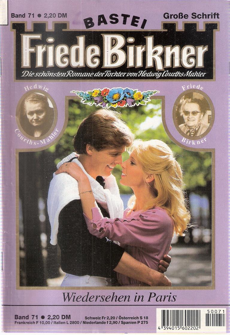 Friede Birkner Nr. 71Die schönsten Romane der Tochter vonHedwig Courths MahlerWiedersehen in ParisVerlag: Bastei LübbeRomanhefte 65 SeitenFormat: 15,5 x 22,5 cmGewicht: 65 gZustand: gebraucht, gutRomanhefte - Liebesromane