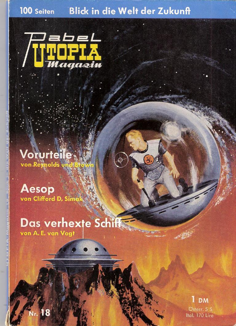 Blick in die Welt der ZukunftDeutschlands erstes Science-Fiction-MagazinPabel Utopia Magazin Nr. 18Titel: VorurteileAutor: Reynolds und BrownTitel: AesopAutor: Clifford D. SimakTitel: Das verhexte SchiffAutor: A.E. van VogtVerlag: PabelRomanheft 100 SeitenFormat: 14 cm x 20,5 cmGewicht: 95 gZustand: Heftrücken oben und unten beschädigt, sonst gut erhaltenes Exemplar Romanhefte SF - Utopia