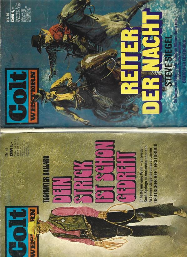 Colt Western Nr. 44 + 59Nr. 44 Dein Strick ist schon gedreht von Todhunter Ballard.Nr. 59 Reiter der Nacht von Steve Siegel.Erich Pabel Verlag2 Romanhefte á 62 SeitenFormat: 15,5 x 22,5 cmZustand: gebraucht, gut