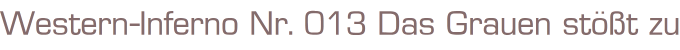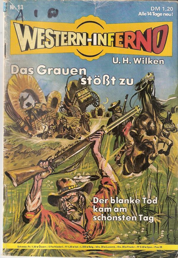 Western-Inferno Nr. 013 Titel: Das Grauen stößt zu Autor: U. H. WilkenVerlag: Marken Verlag 1976Romanheft 64 SeitenFormat: 15,5 x 22,5 cm Zustand: leichte Gebrauchsspuren,Sammelmarke auf der letzten Seite herausgeschnitten.