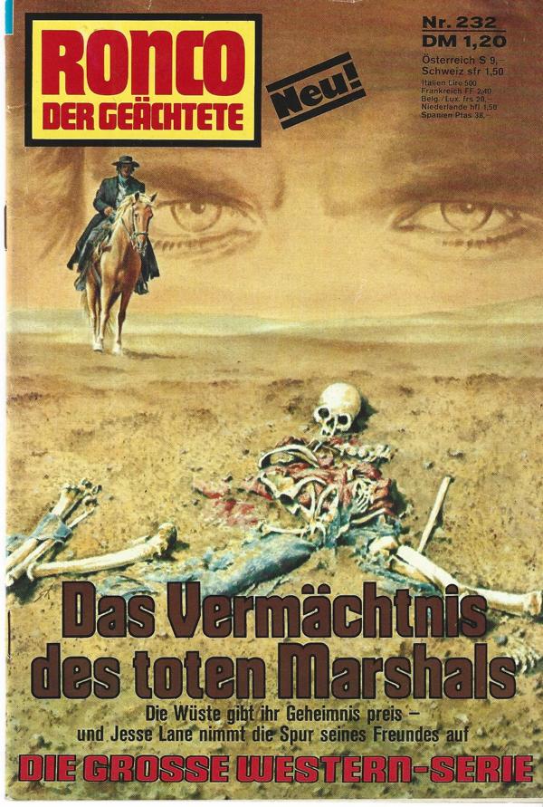Ronco - Der Geächtete Nr. 232Das Vermächtnis des toten Marshals.Autor: Everett JonesVerlag: Erich Pabel Rastatt 1976Romanhefte 64 SeitenFormat: 15,5 x 22,5 cmZustand: sehr gut