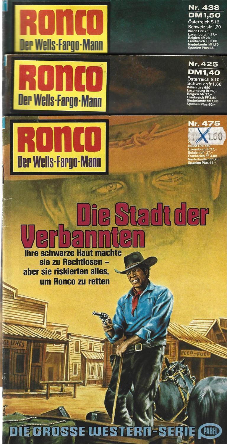Ronco - Der Wells-Fargo-Mann 3 HefteNr. 425 Die ewige Nacht von Everett JonesNr. 438 Der Bruder des Teufels von Jim ElliotNr. 475 Die Stadt der VerbanntenVerlag: Erich Pabel Rastatt3 Romanhefte á 64 SeitenFormat: 15,5 x 22,5 cmZustand: gebraucht, sehr gut