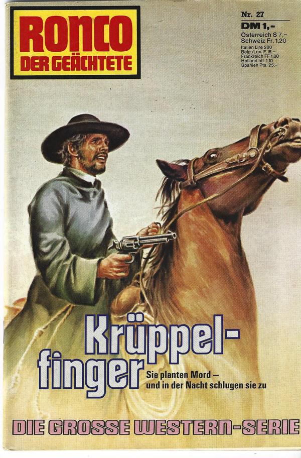 Ronco der Geächtete Nr. 27Krüppelfinger.von: Ken ConagherVerlag: Erich Pabel Verlag, Rastatt 1972Romanheft 66 SeitenFormat: 15,5 x 22 cmZustand: sehr gut